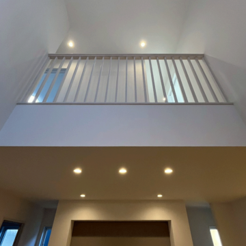 2階から子供達へ声を掛けられるため、コミュニケーションが取りやすい。吹き抜けから降り注ぐ自然光で明るく開放的なリビングを実現。
