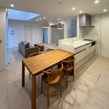 ホワイトカラーでまとまった洗練されたオシャレなリビング、広々したリビングと2階とをつなぐ吹き抜け。家族のつながりを重視した開放的な間取りです。